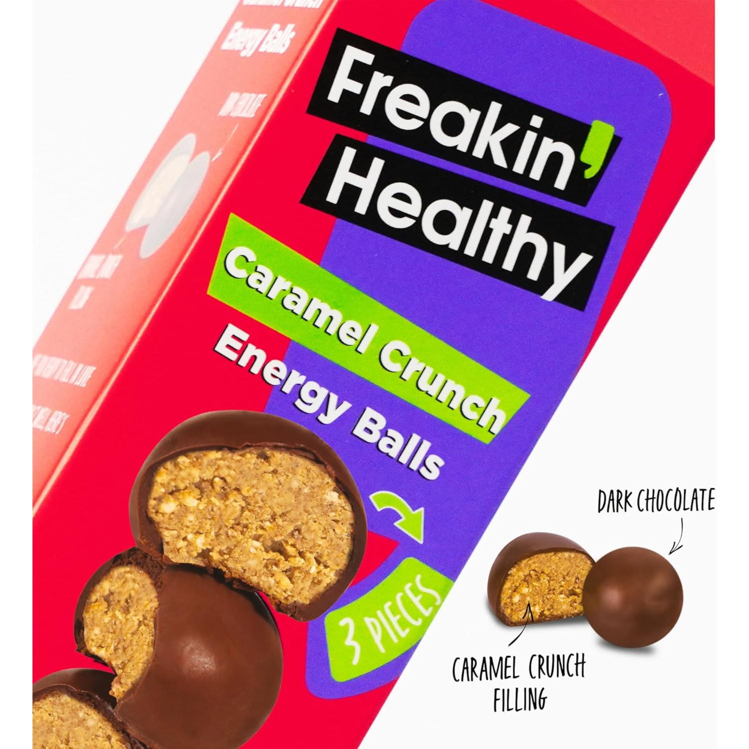 Freakin Healthy Caramel Crunch Energy Balls are the ultimate guilt-free indulgence. Each bite delivers a satisfying blend of chewy and crunchy textures, combining a smooth caramel-like filling with crispy quinoa and a rich dark chocolate coating.